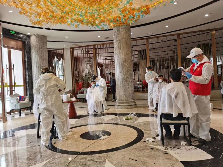 目前正值疫情防控決戰(zhàn)階段,為了確保整個理發(fā)過程安全有序,此次理發(fā)活動選在公司防疫項目建設(shè)人員集中居住的紐賓凱大酒店,志愿者們均由公司指派專人開車提前1個小時從漢陽、漢口接至酒店,進入大堂之前,所有人員均進行了體溫檢測,并分發(fā)口罩,理發(fā)開始后則按照每四人一組進行輪換理發(fā),避免人員集中。整個理發(fā)過程持續(xù)了近4個小時,在4位理發(fā)師的精心打理下,70余名項目一線人員從“油膩大叔”秒變“帥氣小伙”。