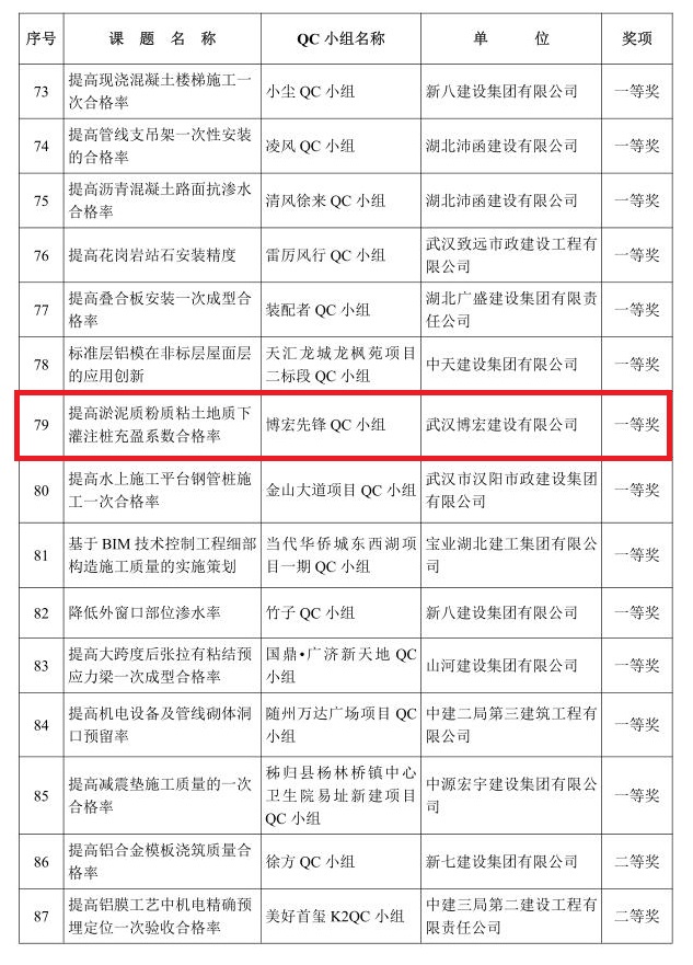 每年,公司都根據(jù)各大在建項(xiàng)目的實(shí)際情況,針對(duì)生產(chǎn)中的難題,從挖潛增效、強(qiáng)化管理等角度確定課題,成立相關(guān)技術(shù)攻關(guān)小組,構(gòu)思切實(shí)可行的質(zhì)量提升措施,并邀請(qǐng)技術(shù)專家對(duì)其進(jìn)行指導(dǎo)完善。本次獲得一等獎(jiǎng)的《提高淤泥質(zhì)粉質(zhì)粘土地質(zhì)下灌注樁充盈系數(shù)合格率》,在其攻關(guān)過程中,“博宏先鋒 QC 小組”制定了嚴(yán)格的工作計(jì)劃和科學(xué)的攻關(guān)流程,按月推進(jìn),最終形成了一套可復(fù)制、可推廣的工作經(jīng)驗(yàn),攻關(guān)小組也通過QC活動(dòng)掌握了一套提升項(xiàng)目管理質(zhì)量的方法論。
